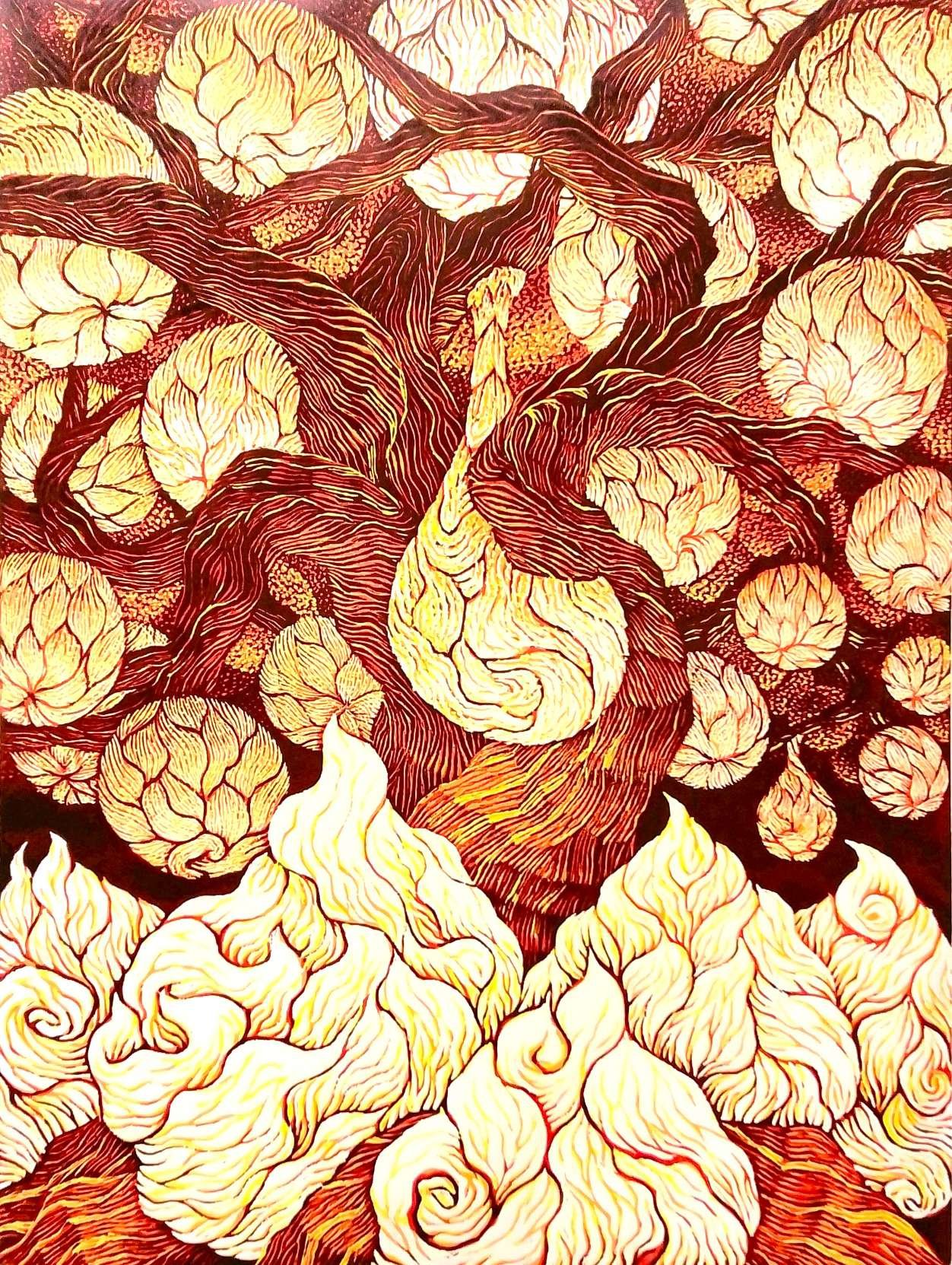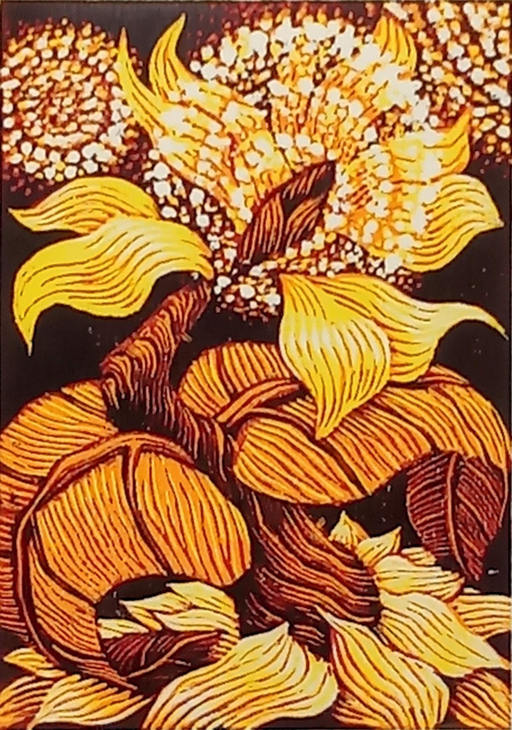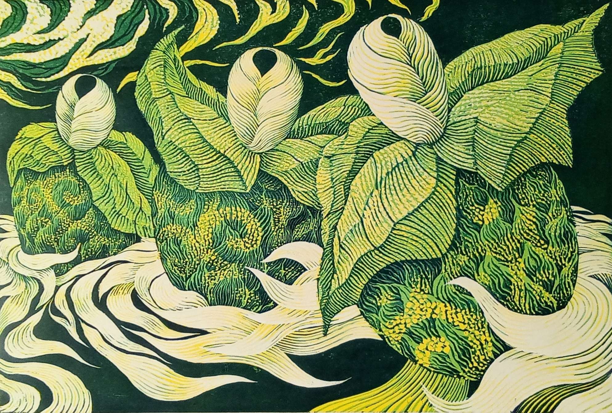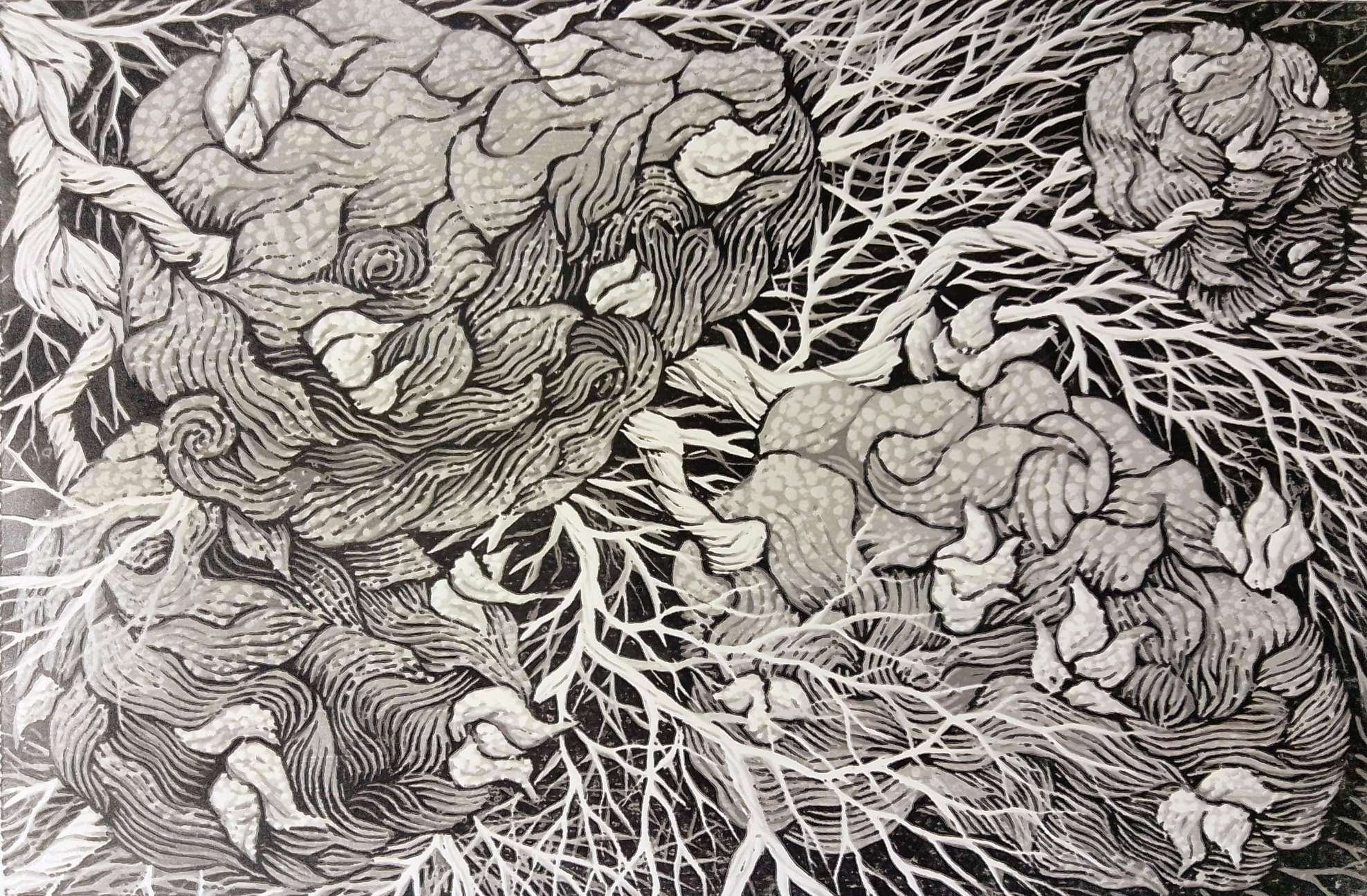 彫りすすめによる凸版木版画 油性インク刷りと一部水性手彩色。